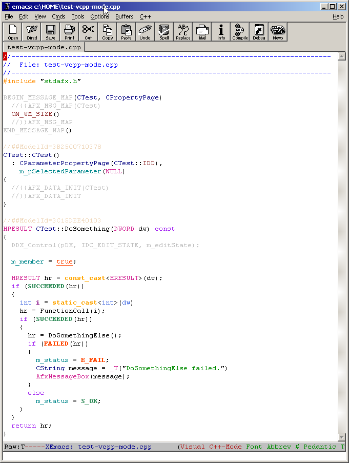 vcpp-mode is a mode for (X)Emacs to edit Visual C++ files. vcpp-mode is based on cc-mode and offers the following extensions:
